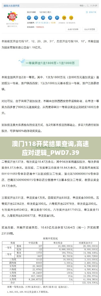 近年来,澳门118开奖结果查询成为了公众关注的热点话题。随着科技的进步和网络的发展,数据的实时更新与查询变得尤为重要。本政策文件旨在阐述澳门118期开奖结果的相关信息及高速应对逻辑,为广大用户提供高效、准确的信息查询平台。